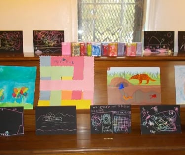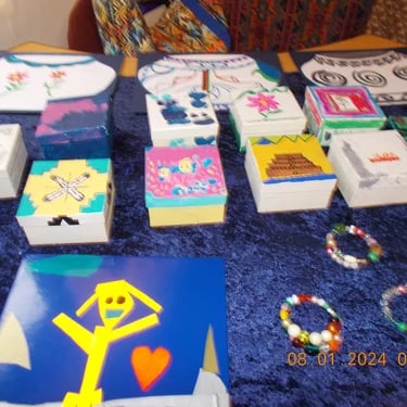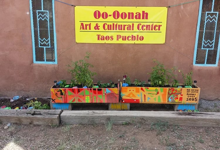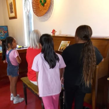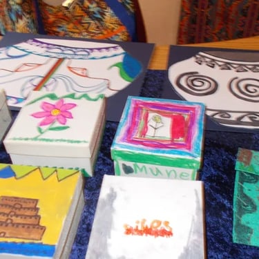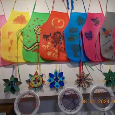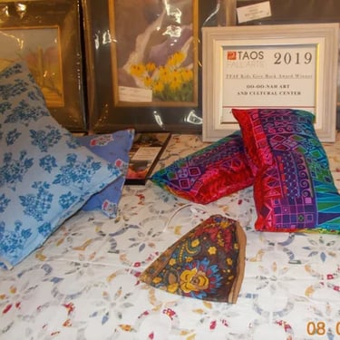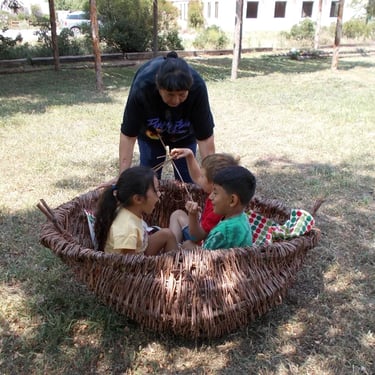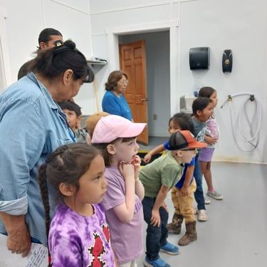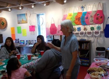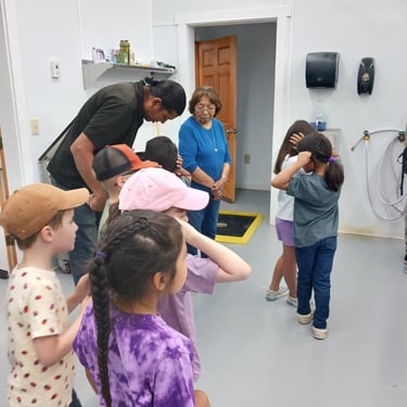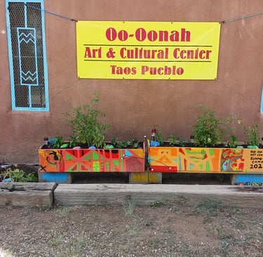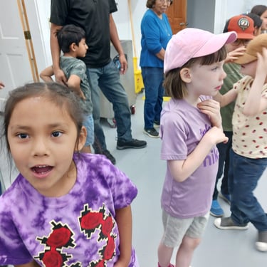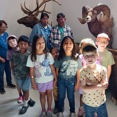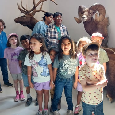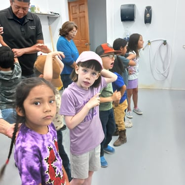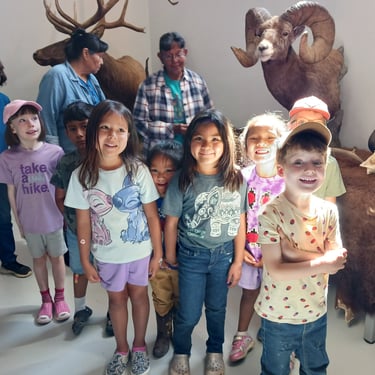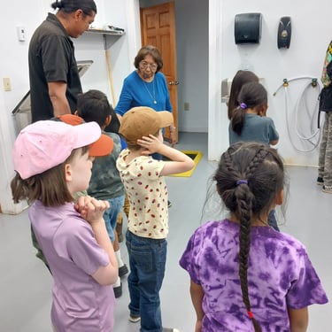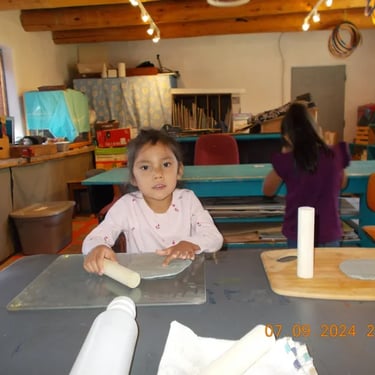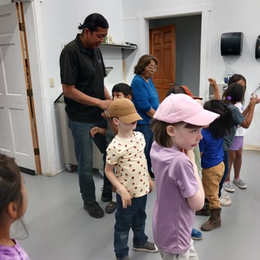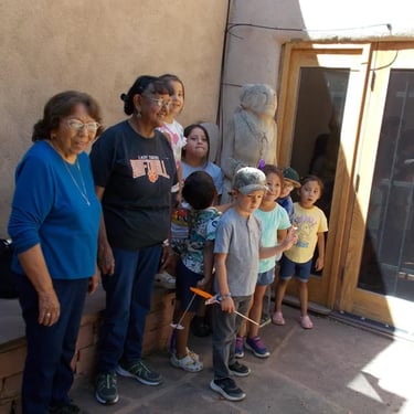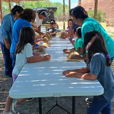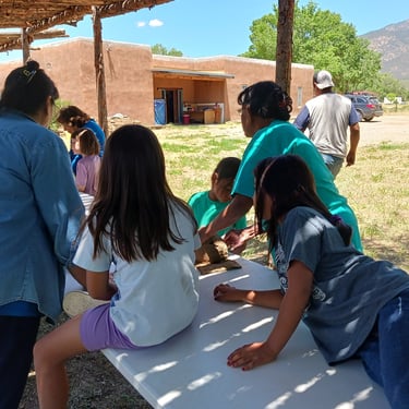 Below are some of the pictures from 2024 Summer Camp with Children, Staff, Volunteers and lots of arts and crafts, such as Sticky Art, Blue Corn Tortilla making, Trip to Millicent Rogers Museum of Art, Children playing in Woven Red Willow Basket, Children learning songs in Tiwa, and Artwork done by the Children and Staff.